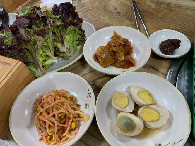밑반찬은 매일매일 달라진다고 하더라고요, 오늘은 계란 장조림, 콩나물 무침, 어묵볶음, 상추와 마늘이 나옵니다
